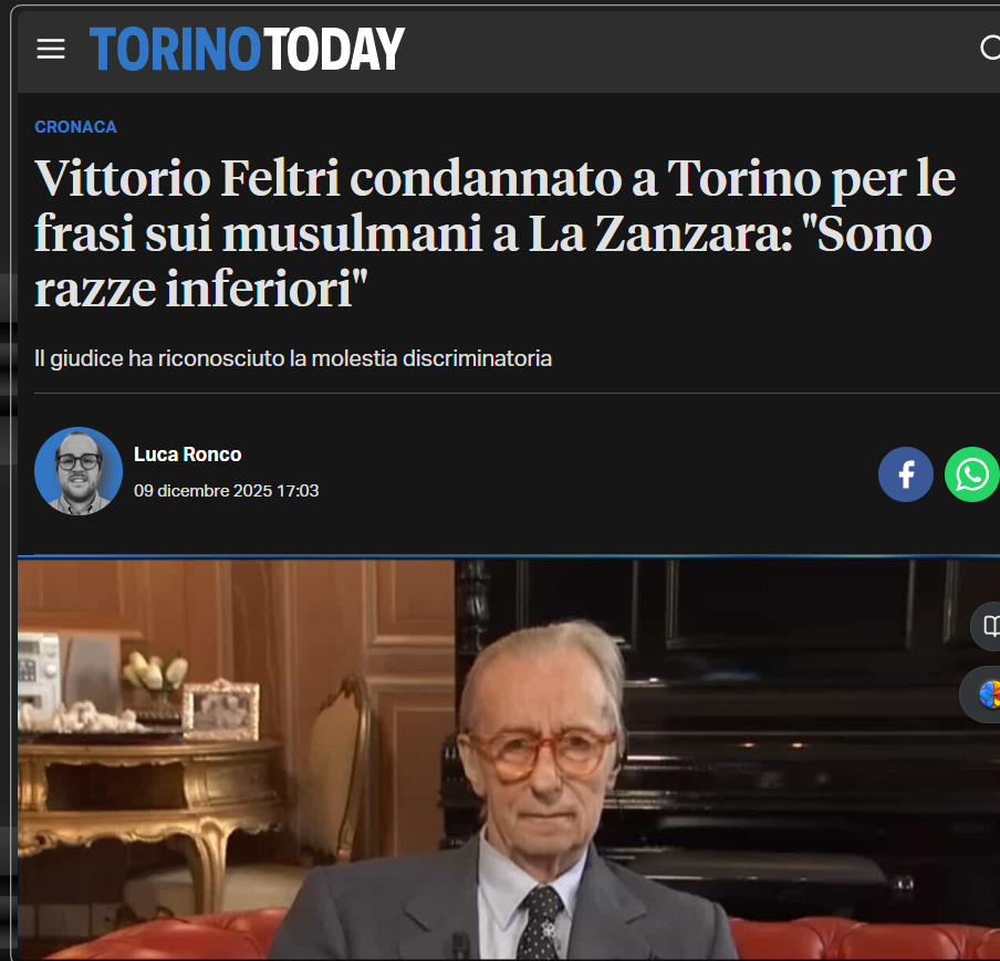 - Vittorio Feltri condannato a Torino per le frasi sui musulmani a La Zanzara: "Sono razze inferiori" - TorinoToday 09 dicembre 2025