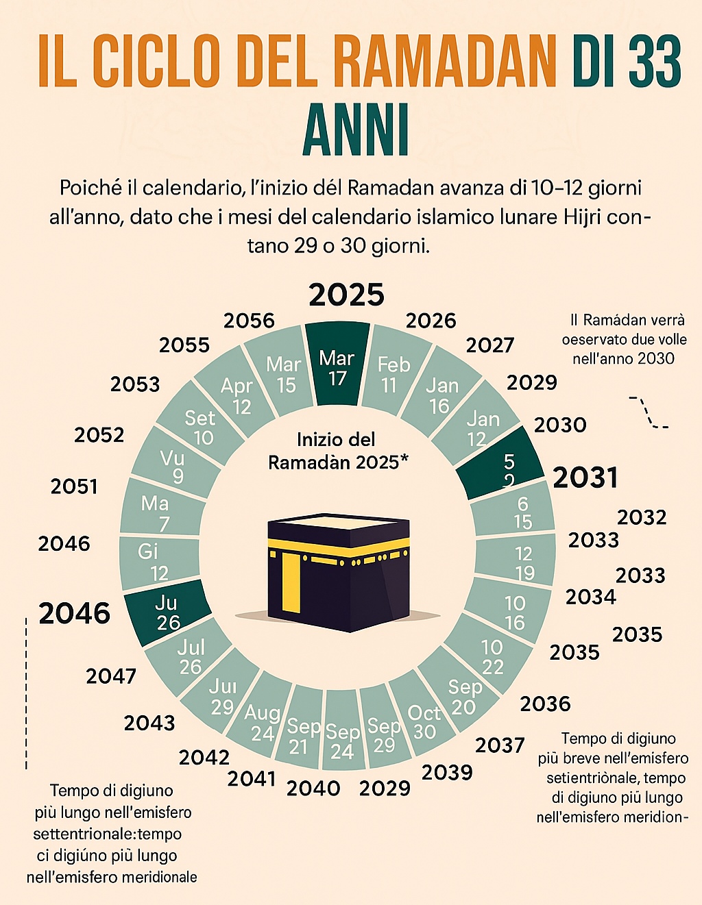 Per introdurre brevemente si fa presente che il calendario islamico è basato sul ciclo lunare sinodico (29,53 giorni siderali circa) ed ogni inizio mese, ricorrenza, festività cade in un periodo diverso ogni anno (solare), essendo i due periodi annuali di diversa durata: l'anno lunare é circa 11 giorni inferiore (12 quando l'anno è bisestile, mediamente 10 giorni e 21 ore) rispetto a quello solare (su cui si basa il calendario gregoriano occidentale), per cui ogni festività ad esempio, cade ogni anno 10 o11 giorni prima rispetto l'anno precedente. Il ciclo si chiude in circa 33 anni, per far coincidere nuovamente l'inizio dei dei periodi.